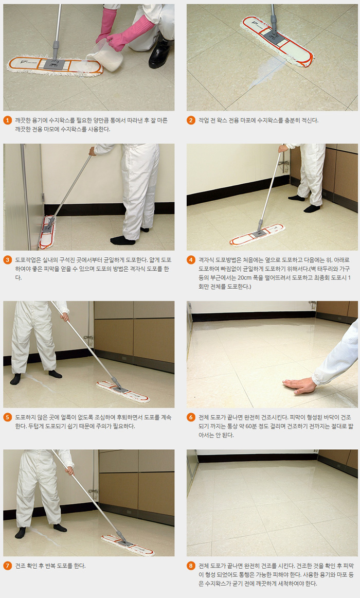 내마모성과 내수성이 우수하여 UV코팅딘 바닥의 관리에 적합합니다.